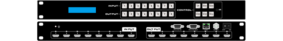 8X8 HDMI固化矩阵,1U 支持EDID读取 支持HDMI1.4,HDCP1.4 支持RS232/iPad/APP/WEB GUI/ 前面按键控制/遥控