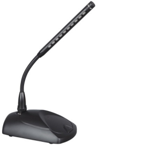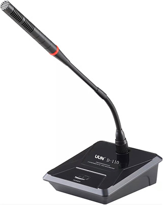 2、固定阵列式双电容话筒杆,内置两个14MM镀金音膜咪芯,超强指向,有效拾音距离可达40-60cm以上,咪杆工作状态亮灯显示。