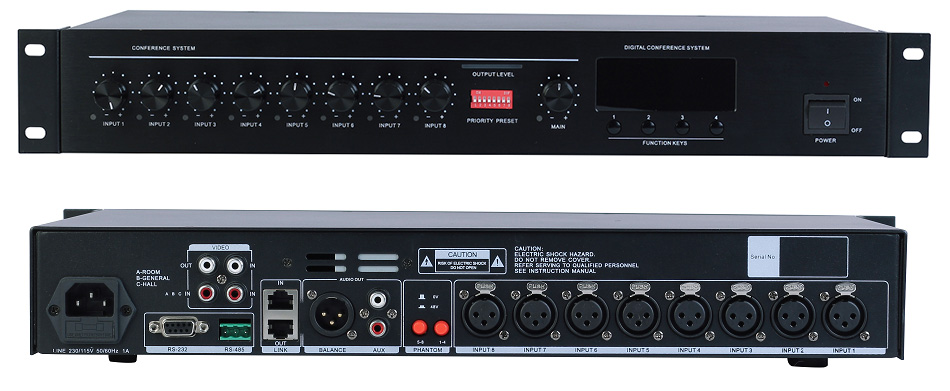 本系统由高速DSP微处理器控制的8通道智能会议混音器。集混音器、视像跟踪解码器,视频矩阵等于一体。采用独创的差分声音对比检测系统,消除传统混音器丢字的问题。支持视像跟踪功能,无需外接解码器直接与摄像头连接使用。另外还可支持RS-232外部控制功能。支持最多16台本机扩展及多达8台摄像头同时配合使用。话筒的控制及噪声和反馈处于DSP微处理器控制之下,增加清晰度和音频质量。